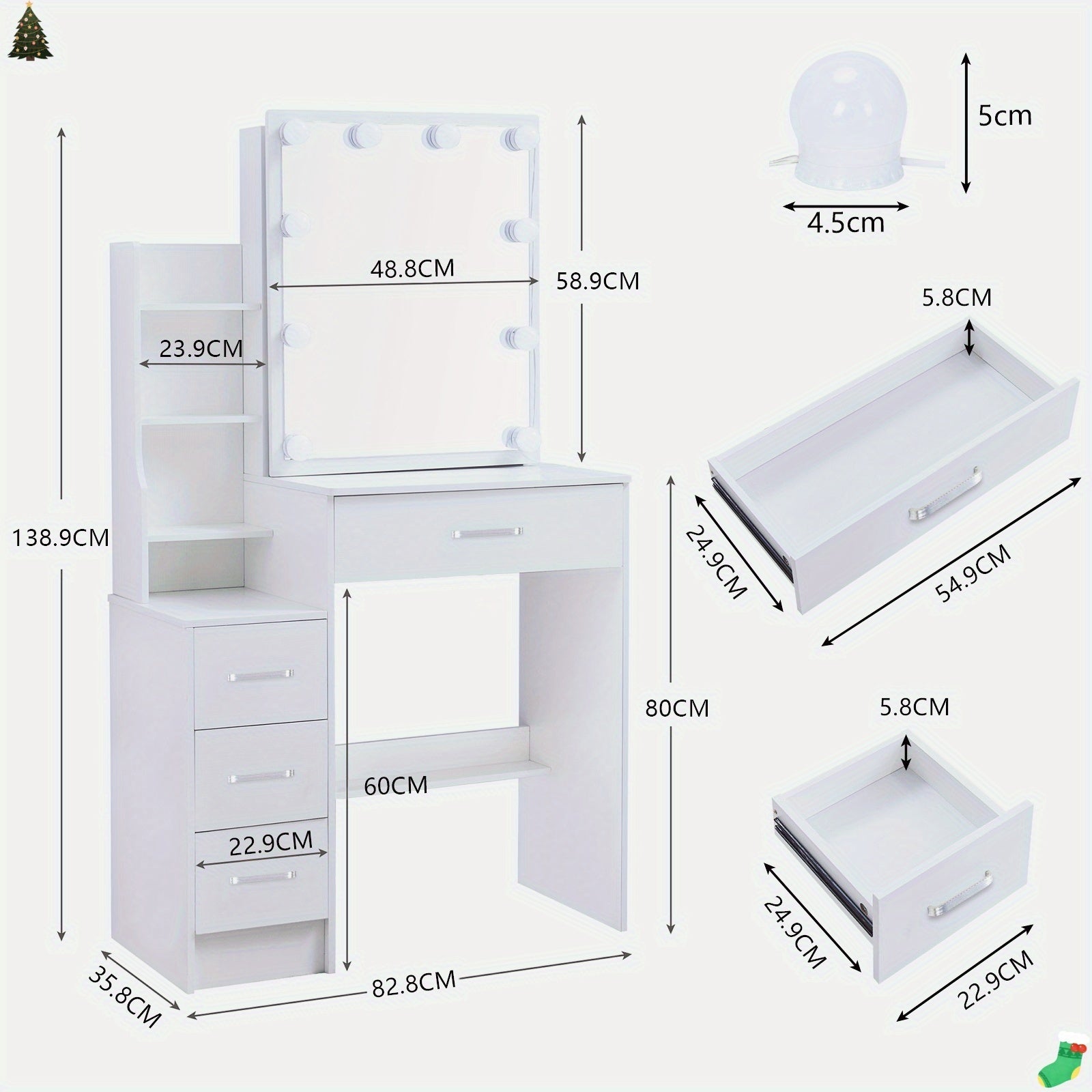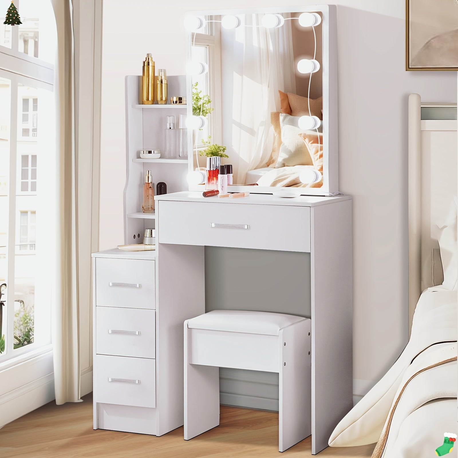Cette coiffeuse pratique est équipée d'un tiroir utilitaire pour garder vos produits de beauté et accessoires bien organisés et à portée de main. Elle est livrée prête à être installée, vous faisant gagner du temps. De plus, elle intègre une alimentation USB, idéale pour brancher un miroir lumineux ou recharger un petit appareil, transformant votre routine de maquillage en un moment fluide et agréable.